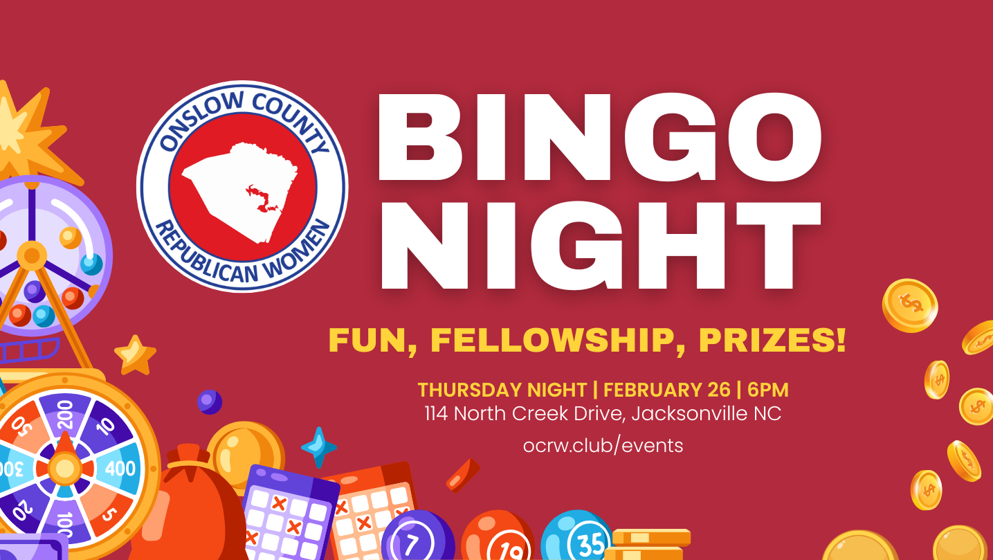 Join your fellow Republican Women for a night of fun, fellowship, and prizes at BINGO NIGHT! It's sure to be an evening full of laughs, and it won't be the same without YOU! Bring a friend, bring your cash, bring your smile!